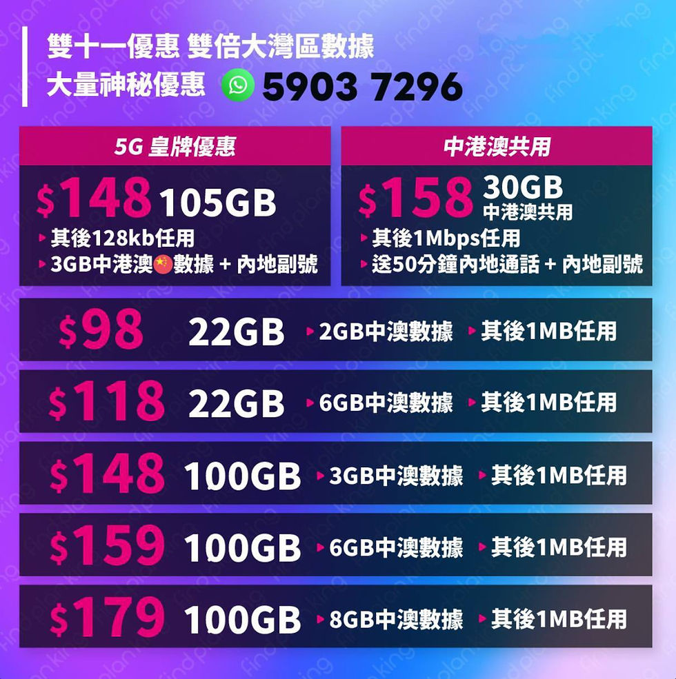 ✅以上5G計劃可加內地澳門數據$20 1GB/$38 2GB/$68 10GB/$128 20GB