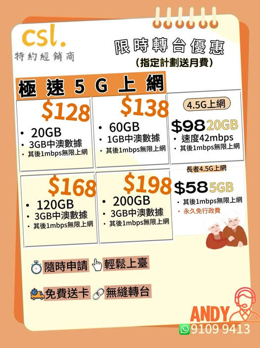 csl.本月最新新轉台優惠 5G極速賣熱優惠 $168月費5G全速120GB +其後1mbps任用 ✅送本地限無分鐘 ✅送每月3GB 大陸澳門數據 ‼️豁免$18行隧政道費 4.5G 限時優惠 1️⃣$98月費4.5G 20GB +其後1mbps任用(‼️限時) ✅送本無地限分鐘 ‼️豁免$18行政道隧費(限時)